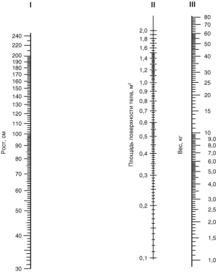 Значение площади поверхности тела находят в точке пересечения прямой, соединяющей показатели роста (на шкале I) и веса (на шкале III), со шкалой II. C. D. West. Electrolyte Imbalance and Parenteral Fluid Therapy. Procedures in use at Children's Hospital Medical Center, Cincinnati, OH.