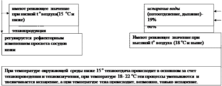 Изотермия поддерживается балансом между образованием и отдачей тепла. Величина теплообразования зависит от интенсивности химических реакций, характеризующих уровень обмена веществ. Тепло образуется во всех тканях, но в большей степени в печени, где происходят наиболее интенсивные обменные процессы, и в мышцах. Теплоотдача регулируется преимущественно физическими процессами (теплоизлучение, теплопроведение, испарение). При чрезмерно низкой или очень высокой температуре среды защитные терморегуляционные механизмы оказываются недостаточными и температура тела начинает резко падать или повышаться. В первом случае развивается состояние гипотермии (температура тела ниже 35 °С), во втором— гипертермии (температура тела выше 37 °С). От гипертермии следует отличать лихорадку. Лихорадка — это защитная реакция организма, которая проявляется повышением температуры тела на вредные агенты (микробы, вирусы, продукты распада тканей и др.), нарушающие функцию центра регуляции теплообмена (внешние условия при этом не изменены). Лихорадка губительно действует на возбудителей болезни.