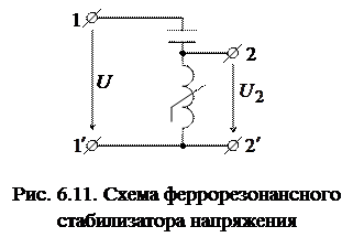 последовательно включенных элементов нелинейной цепи с изменением напряжения питания, при котором относительное изменение напряжения на одном из участков цепи оказывается значительно ниже, чем на входе. Так в цепи на рис. 6.11 с увеличением напряжения питания ток резко возрастает, и его увеличение приводит к уменьшению индуктивности катушки со стальным сердечником, в то время как емкость конденсатора остается без изменений. Присоединение приемника к вторичным выводам стабилизатора создает ветвь, параллельную нелинейной катушке, в результате чего ток в катушке уменьшается. С изменением напряжения питания полное сопротивление между выводами 2-2’ изменяется меньше, чем при отсутствии нагрузки, а, следовательно, ухудшаются стабилизирующие свойства цепи. Коэффициент стабилизации нагруженного стабилизатора обычно ниже, чем в режиме холостого хода