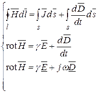 Уравнения Максвелла являются фундаментальными уравнениями электромагнитного поля. Эти уравнения могут быть записаны в интегральной, дифференциальной или комплексной форме. Интегральная форма записи уравнений устанавливает связь между величинами в разных точках поля или на разных отрезках, поверхностях. Дифференциальная форма описывает соотношение между величинами вблизи одной и той же точки поля в определенный момент времени. Эту форму записи применяют при исследовании полей, изменяющихся от точки к точке. Гармонически изменяющиеся электромагнитные поля (когда проекции вектора на координатные оси являются гармоническими функциями времени) удобно характеризовать уравнениями Максвелла в комплексной форме. Переход от интегральной формы записи уравнений к дифференциальной осуществляется с помощью теорем Остроградского-Гаусса и Стокса (14.20) и (14.21). Система уравнений электромагнитного поля включает в себя четыре основных уравнения Максвелла и уравнения связи между векторами поля и параметрами 1. Закон полного тока – первое уравнение Максвелла