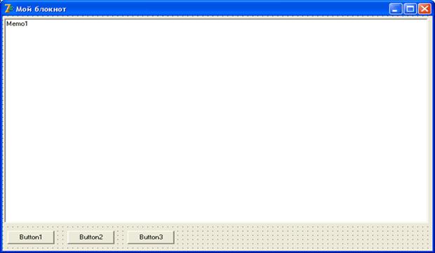 Каждый пользователь, работающий с Windows, хоть раз да использовал простой текстовый редактор Блокнот. Сейчас мы создадим немного упрощенную версию Блокнота, которая позволяет вводить текст, сохранять его на диск, и загружать с диска. Для этого нам требуется создать новый проект. Если в данный момент у вас уже открыт какой либо проект, выберите команду меню "File – Close All (Файл – Закрыть всё)", затем "File – New – Application (Файл – Новое – Приложение)". У нас есть новая форма, и пока больше ничего нет. Сразу изменим некоторые свойства формы. В свойстве Caption впишите "Мой блокнот" (естественно, без кавычек). Свойство Name изменим на "fMain". Совет: чтобы легче ориентироваться в названиях модулей (файлов с кодом) и форм, лучше сразу выработать правила: 1. Перед названием формы будем указывать маленькую букву f, чтобы показать, что это именно форма. 2. Имена форм будем подбирать информативные, чтобы было понятно, с какой формой мы имеем дело. 3. Модули форм будем называть так же, но без буквы f. 4. Главную форму всегда будем называть fMain, а модуль, соответственно, Main. Эти рекомендации не являются обязательными, но в дальнейшем, когда пойдут проекты с множеством форм, они помогут вам ориентироваться в названиях. Можете выработать собственные правила. Сохраним проект в отдельную папку. Модуль называем Main, а проекту даем имя MyNotebook. Теперь познакомимся с новым, мощным компонентом Memo, который находится на вкладке Standard и предназначен для ввода пользователем многострочного текста. Установите этот компонент на форму, в верхнюю левую часть формы, и растяните его по форме, оставив внизу немного места. Вниз установите, одну рядом с другой, три кнопки Button. У вас должно получится что-то вроде этого: