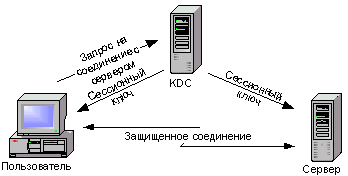 Представленные механизмы аутентификации обеспечивают высокую надежность, однако необходимо решить проблему первоначального обмена общими секретами. Если каждому клиенту для поддержания связи с каждой службой требуется индивидуальный ключ, и такой же ключ нужен каждой службе для каждого клиента, то проблема обмена ключами быстро становится достаточно острой. Для решения проблемы управления ключами Kerberos использует дополнительное звено-посредник – центр распределения ключей (Key Distribution Center, KDC). KDC представляет собой службу, работающую на физически защищённом сервере. Она ведёт базу данных с информацией об учётных записях всех главных абонентов безопасности своей области. Вместе с информацией о каждом абоненте безопасности в базе данных KDC сохраняется криптографический ключ, известный только этому абоненту и службе KDC. Этот ключ, который называют долговременным, используется для связи пользователя системы безопасности с центром распределения ключей. В большинстве практических реализаций протокола Kerberos долговременные ключи генерируются на основе пароля пользователя, указываемого при входе в систему. Когда клиенту нужно обратиться к серверу, он прежде всего направляет запрос в центр KDC, который в ответ направляет каждому участнику предстоящего сеанса копии уникального сеансового ключа, действующие в течение короткого времени. Назначение этих ключей – проведение аутентификации клиента и сервера. Копия сеансового ключа, пересылаемая на сервер, шифруется с помощью долговременного ключа этого сервера, а направляемая клиенту – долговременного ключа данного клиента (рис. 9).