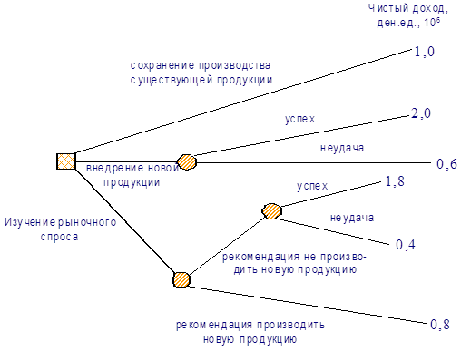 Процесс выбора при наличии риска может быть представлен в виде графа – так называемого дерева решений. Дерево решений показывает решения, которые могут быть приняты, возможные результаты и вероятности получения этих результатов при осуществлении каждого из этих решений. Пример. Предположим, что предприниматель рассматривает вопрос о разработке и выпуске новой продукции. Если продукция будет принята покупателем, предприниматель получит прибыль, но если продукция не будет пользоваться спросом, он не оправдывает своих затрат. Предприниматель исходит из того, что его новая продукция будет распродана с вероятностью 50%. Ему поступило предложение поручить другой фирме обследование рыночного спроса с соответствующей оплатой этой работы. Анализируя предшествующие отчеты, предприниматель может быть уверен на 90%, что если эта фирма даст рекомендацию на освоение новой продукции, то она будет принята покупателем. Следовательно он имеет следующие варианты выбора решения: § оставить ассортимент продукции прежним; § разрабатывать новую продукцию; § прежде заплатить за изучение рыночного спроса и затем последовать рекомендациям фирмы. Дерево решения, соответствующее этой задаче, представлено на рис. 1. Здесь на концах ветвей проставлены значения возможной прибыли при каждом из трех решений при условии, что в случае изучения рыночного спроса фирме, проводящей такое исследование надо заплатить 2×106 ден. ед. Если сопоставить каждой из ветвей (решению), соответствующей определенному результату некоторую вероятность, то можно рассчитать полезность каждого решения.