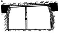 План. 1. Фактори, що впливають на вибір форми поперечного перерізу. 2.Площа поперечного перерізу у світлі і в проходці. 3.Вимоги ПБ до площ поперечного перерізу. 4. Крілення гірничих виробок. Зміст лекції. 1. Форма поперечного перетину горизонтальних виробок встановлюється відповідно до фізико-механічних властивостей порід та стану порід, якими вони проводяться, величини та напрямку гірського тиску, терміну служби та прийнятої конструкції кріплення. Якщо виробку не кріплять, їй надається склепінна форма поперечного перетину, яка наближається до форми склепіння природної рівноваги. Прямокутна форма (рис.1 а) найчастіше використовується при відсутності бокового тиску порід й у тих випадках, коли виробки кріпляться дерев’яним, штанговим або змішаним кріпленням (бетонні стінки і перекриття з металевих балок). Трапецієподібне кріплення сприймає як вертикальний, так і боковий тиск. При цій формі виробки звичайно кріплять деревом, металом, збірним залізобетоном (рис.1 б). Поширено при проведенні нарізних виробок.