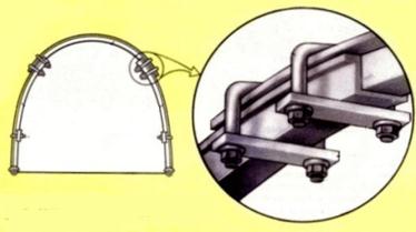 Рис. 3– Металеве кріплення Трапецієподібні металеві рами відносяться до жорсткого кріплення і застосовуються у виробках із значним терміном службі (більше 3—5 років). Трапецієподібні металеві рами застосовують у виробках із терміном служби від 3 до 10 років при стійкому гірничому тиску. Елементи трапецієподібних рам виготовляють із двотаврових балок № 16—17. З'єднання верхняка зі стояками здійснюють за допомогою накладок або спеціальних башмаків. Гідностями металевого трапецієподібного кріплення є простота виготовлення й установки. Недоліками є відсутність податливості, і менша несуча спроможність елементів кріплення, чим в аркових конструкціях. Арковекріплення виконується у вигляді жорстких, шарнірних або податливих конструкцій. Жорстке кріплення виготовляється у вигляді двохшарнірної арки із двотавру № 14—20, із залізничних та рудничних рейок і звичайно складається з двох піварок, що поєднуються у замку за допомогою металевих накладок і болтів. Найбільш поширене аркове податливе трьохланкове кріплення КМП-А3 зі спецпрофілю СВП, що складається з 3-х елементів: верхнього сегмента, обкресленого одним радіусом, і 2-х бічних елементів, криволінійних по всієї довжині або що мають прямолінійну ділянку