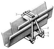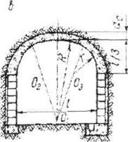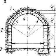 Рис. 4– Конструкція аркового металевого податливого кріплення; замок 1, 2 – скоба, 3 – верхня планка, 4 – нижня планка, 5 – гайка Для забезпечення стійкості у подовжньому напрямку між рамами, арками або кільцями кріплення обов’язково повинні встановлюватись дерев’яні або металеві розпірки в кількості не менше двох на кожний елемент. Іноді дерев’яні розпірки встановлюють суцільно, тоді вони виконують роль звичайної затяжки. Кам'яне і бетоннекріплення застосовують для кріплення виробок із великим терміном служби і при значному гірському тиску поза зоною впливу очисних робіт (рис. 5). Бетоном і каменем кріплять переважно основні виробки приствольного двора, камери, квершлаги, польові штреки.. Кам'яне кріплення зводиться зі штучних каменів на цементно-пісковому розчині. При значному гірському тиску і зсуві порід застосовують податливе кам'яне кріплення, що будується з литих каменів з укладкою між ними пружних прокладок. В загальному обсязі кріплення кам’яне кріплення є мало поширеним, оскільки для його зведення необхідна цеглина особливої якості (звичайні цеглини швидко розмокають і руйнуються), а також із-за високої трудомісткості зведення. Те ж стосується і кріплення із бетонних блоків (бетонітів).