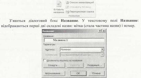 Прокрутний список Добавлять название при вставке объекта: містить імена усіх тих типів об’єктів, вставляння яких можна супроводжувати автоматичним вставлянням назви об’єкта. Якщо ліворуч від імені типу встановлено прапорець — значить, передбачено автоматичне вставляння назви в разі вставляння об’єкта даного типу. Виділивши рядок з іменем типу, можна побачити в полі списку подпись: мітку, назва з якою вставлятиметься; її можна змінити, вибравши у вказаному списку іншу (якщо прапорець не встановлено, поле списку буде недоступним). Якщо потрібної мітки в списку немає, її можна створити, натиснувши кнопку Создать. 3. Встановити у вказаному списку прапорець ліворуч від одного з тих типів об’ єктів, назви до яких Ви хотіли б вставляти автоматично, одночасно з вставлянням об’єкта. 4. Розгорнути в секції Параметры список подпись: і вибрати в ньому мітку, назва з якою має вставлятися. 5. У розгортному списку положение: вибрати варіант розміщення назви (під об’єктом чи над ним). 6. Якщо є потреба, можна - натиснувши кнопку Нумерация: - встановити нові параметри нумерації назв з вибраною міткою. 7. Повторити пункти 3-6 для кожного з тих типів об’єкта, вставляння яких має супроводжуватись автоматичним вставлянням назви. Таким чином, можна призначити однакову мітку кільком різним типам об’єктів. 8. Натиснути кнопку ОК. Бокс Автоназвание зникне, зроблені призначення збережуться в пам’яті і будуть діяти при вставлянні об’єктів. Редагування, форматування і оновлення назв Усі назви документу Word форматує за замовчуванням спеціальним стилем Название объекта. Цей стиль можна, звичайно, змінити відповідно до Ваших уподобань, але в цьому разі відповідно зміняться назви об’єктів усіх типів. Якщо Ви хочете мати різне оформлення назв об’єктів різного типу, можна створити окремі стилі для кожної з міток (свій стиль - для назв рисунків, свій - для назв таблиць тощо) і застосувати ці стилі до вставлених назв. Щодо редагування назв треба розуміти, що усі три складові назви (мітка, номер, пояснювальний текст) мають свою специфіку. Редагувати звичайними засобами можна тільки пояснювальний текст. Мітку кожної окремої назви змінити можна, але важко уявити ситуацію, коли це мало б хоч якийсь сенс. Інша справа, що може виникнути потреба змінити мітки усіх назв об’єктів певного типу. Це можна зробити так. 1. Виділити будь-яку назву з міткою, яку Ви хочете змінити. 2. Викликати діалоговий бокс Название. 3. Розгорнути в цьому боксі список подпись: і вибрати в ньому ту мітку, якою Ви хочете замінити мітки, однакові з міткою виділеної назви (якщо потрібної мітки немає в списку - її можна створити, натиснувши кнопку Создать). 4. Натиснути кнопку ОК. Бокс Название зникне, усі назви, що мали ту саму мітку, що й назва, виділена у пункті 1, отримають нову мітку. Описаний спосіб діє лише в тому разі, коли мітка, що замінюється, не має в своєму складі деяких "нестандартних" символів (наприклад, "нерозривного пробілу"). Номер назви редагувати звичайними засобами Word не вдасться - на нього можна вплинути лише змінивши нумерацію назв з відповідною міткою. Вже говорилося, що в разі, коли Ви видалили з документа якийсь об’єкт, що мав назву, додали або перенесли такий об’єкт, нумерація об’єктів з тією ж міткою автоматично коригується, залишаючись правильною. Але варто пам’ятати, що для того, 