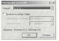 3. У списку подпись виберіть найбільш підходящий підпис для об’єкта, наприклад "Рисунок" або "Формула". Якщо в списку немає підходящому підпису, натисніть кнопку Создать, введіть новий підпис у поле Название й натисніть кнопку ОК. 4. Введіть будь-який текст, включаючи розділові знаки, який повинен відображатися після підпису. 5. Вибрати у списку положение: варіант розміщення назви: під виділеним об’єктом чи над ним. 6. Натиснути кнопку ОК. Діалоговий бокс зникне, відновиться текст документа. До об’єкта, що був виділеним, буде додано сформовану Вами назву. Якщо пропустити перший пункт наведеної послідовності, тобто не виділяти об’ єкт, до якого додається назва, список положение буде недоступним, і назва з’явиться там, де було встановлено курсор перед початком процедури. Нумерація назв Назви Word нумерує обов’язково, і робиться це автоматично, але формат номера можна вибрати (є п’ять варіантів, див. нижче). Крім того можна включити до номера (точніше - вставити перед ним, відокремивши спеціальним символом) номер заголовка того підрозділу документа, де міститься об’єкт з даною назвою. Рівень заголовка, номер якого буде додаватися, теж можна встановити за бажанням. За замовчуванням назви нумеруються арабськими цифрами, починаючи з одиниці, причому номер заголовка до номера назви не додається. Але можна встановити й інші значення параметрів нумерації. Це можна зробити в ході створення нової мітки. Можна також змінити нумерацію вже створених назв. Розглянемо перший випадок. Щоб встановити параметри нумерації, які відповідають Вашим потребам (в межах вказаних можливостей), треба - викликати діалоговий бокс Название, створити нову мітку назви та виконати такі дії: 1. Натиснути кнопку Нумерация.. З’являється діалоговий бокс Нумерация названий (див. рис. 4.21).