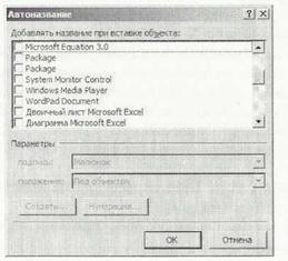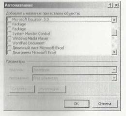 2. Якщо Вас не влаштовує нумерація назв арабськими цифрами, слід розгорнути список Формат: і вибрати в ньому інший варіант. Цей список має ті самі елементи, що й список форматів нумерації виносок, крім останнього. 3. Якщо Ви хочете, щоб до номера назви об’єкту додавався номер заголовка того підрозділу документа, до якого належить об’єкт, треба встановити прапорець Включить номер главы. В результаті стануть доступними розгортні списки начинается со стиля і разделитель:. 4. Вибрати в розгортному списку начинается со стиля рівень заголовка, номер якого буде додаватись (зліва) до номера назви. Наприклад, якщо вибрати рівень Заголовок 2, то додаватиметься номер найближчого (попереду) заголовка другого рівня. Список містить дев’ять елементів від Заголовок 1 до Заголовок 9. 5. Вибрати в розгортному списку разделитель: символ, що відокремлюватиме номер назви від номера заголовка. Word пропонує в цьому списку такі п’ять варіантів вибору: дефіс, крапка, двокрапка, довге тире, коротке тире. 6. Натиснути кнопку ОК. Бокс Нумерация названий зникне, залишиться бокс Название. 7. Натиснути в ньому кнопку OK. Назву з номером буде вставлено в документ. Після цього усі назви, що вставлятимуться з даною міткою, матимуть встановлену нумерацію. Щоб змінити нумерацію вже створених назв з певною міткою, треба: 1. Виділити будь-яку назву з потрібного міткою. 2. Викликати, діалоговий бокс Название. 3. Виконати наведені вище пункти 1-7. В результаті відповідно зміниться нумерація усіх назв, що мають ту саму мітку, що й мітка назви, виділеної у пункті 1. Автоматизоване вставляння назв Якщо в документ доводиться часто вставляти об’єкти певних типів (які саме типи об’єктів є доступними - див. нижче), доцільно ще до початку їх вставляння встановити такий режим, коли вставляння об’єкта спричинятиме автоматичне додавання до нього назви зі заздалегідь встановленою міткою і характером нумерації. Встановити цей режим можна як у процесі створення нової мітки, так і для назв з міткою, що вже є в списку міток. Розглянемо цей останній варіант. Нехай, отже, Ви хочете, щоб у разі вставляння кожного об’єкта певного типу (наприклад, типу Microsoft Clip Gallery, Рисунок Microsoft Word або Paintbrush Picture) до нього автоматично додавалась назва з певною вже створеною міткою (наприклад, Рис.). Для цього слід виконати такі дії. 1. Викликати діалоговий бокс Название. 2. Натиснути кнопку Автоназвание... З’являється діалоговий бокс Автоназвание.