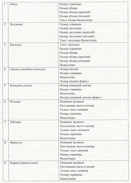 4. Розгорнути список Тип ссылки: і вибрати потрібний тип об’єкта посилання. Скажімо, щоб послатись на якийсь із заголовків, треба вибрати тип Заголовки. 5. Вибрати у розгортному списку Вставить ссылку на: той елемент, значення якого буде вставлено в місце посилання. Набір елементів цього списку залежить від вибору типу об’єкта на попередньому етапі (тобто від того, що в цей час бачимо в полі списку Тип ссылки:). Нижче у табл. 1 наведено ці набори для кожного з вбудованих типів об’єктів і для об’єкта з назвою, створеною користувачем (у таблиці це - Користувацька назва). Таблиця 4.2 Елементи списку Вставить ссылку на:
