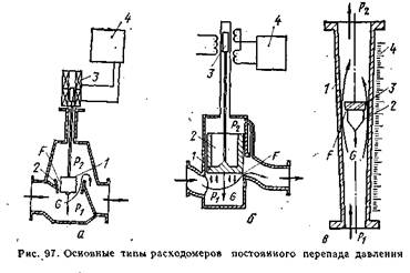 Ротаметр (мал. 1, в) є найпоширенішим приладом постійного перепаду тиску. Він складається з довгої вертикально розташованої конусної трубки 1, усередині якої вільно плаває поплавець 2, виготовлений залежно від меж вимірювання з різних матеріалів (сталі, ебоніту, дюралюмінію, фторопласту). Центрирування положення поплавця усередині потоку досягається використанням спеціальної гвинтової насічки 3 на ободі поплавця. Під дією рухомого потоку поплавець переміщається у вертикальному напрямі і одночасно обертається навколо своєї осі, що і забезпечує його центрування в середині потоку. Положення поплавця усередині корпусу однозначно пов'язане з витратою і може бути визначене безпосередньо за шкалою 4, нанесеною на корпусі (скляний ротаметр), або передається за допомогою пневматичного або електричного перетворювача на вторинний вимірювальний прилад. Потік, що протікає від низу до верху в конусній трубці, обтікаючи поплавець, піднімає його до тих пір, поки площа кільцевого перетину F між поплавцем і внутрішньою поверхнею трубки не досягне такого значення, коли сила тяжіння, що діє на поплавець Gn = gρnVп (Vn - об'єм поплавця, м3; ρn - щільність матеріалу поплавця, кг/м3) не урівноважиться силами, що діють знизу на поплавець, а саме підйомною силою і силою тертя Ртр, що виникає на бічній поверхні поплавця. Підйомна сила створюється за рахунок різниці тих, що діють на поплавець знизу і зверху статичного тиску ΔР1= Сила тертя рівна