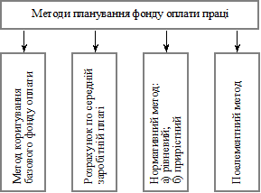 Рис. 9.7. Методи планування фонду оплати праці Для визначення планового фонду оплати праці в перспективних планах можна використовувати збільшені методи. Метод коригування базового фонду оплати праці (ФОПб) на підставі планового зростання обсягу виробництва (Ко), скорочення (збільшення) чисельності працівників у плановому періоді (Є) і досягнутого в базовому періоді рівня середньої заробітної плати (ЗПб):