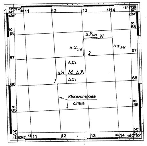 Шукані прямокутні координати Х, Y точок визначаються відносно ліній координатної сітки (рис. 3.3). Координати точок М і N визначають відносно координат південно-західного кута ліній квадрата координатної сітки (точки 1 та 2), в якому знаходиться шукана точка. Прямокутні координати координат шуканих точок Хj, Yj обчислюють за формулами: