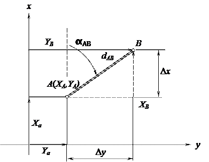де D х, D у – приростки координат заданої лінії. 5. Розв’язання прямої та оберненої геодезичних задач