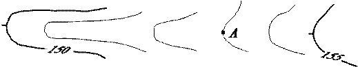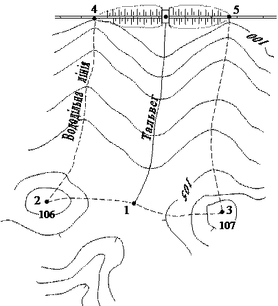 Обчислене значення позначки заокруглюють до метрової поділки. На рис. 3.12 маємо Нг = 132,5 - 4 × 500 = 130,5» 130 м. 8. Розписують шкалу висот згідно вибраного вертикального масштабу Мв через 1 см. Ціна сантиметрової поділки вертикального масштабу дорівнює hп = 1 см × Мв = 1 см × 500 = 500 см = 5 м. Відповідно поділки шкали висот прийняли значення 130, 135,..., 150 м. 9. Від лінії умовного горизонту в точках А, 1, 2,..., В будують перпендикуляри висотою, яка дорівнює позначці точки згідно шкали висот вертикального масштабу. Отримують точки А ¢, 1¢,..., В ¢ і з’єднують їх прямими лініями. Отримана ламана лінія і буде характеризувати профіль місцевості по лінії АВ. З використанням цифрових технологій в автоматичному режимі отримують профіль місцевості по любому напрямку лінії на карті (плані) з графічним зображенням на екрані. 9. Визначення меж водозбірної площі Водозбірною площею називають поверхню землі, з якої за умовами рельєфу збирається поверхнева вода в даний водостік (річку, логовину, яр і т.д.). Межами водозбірної площі служать вододільні лінії рельєфу, що проходять по перпендикуляру до випуклих горизонталей по лініям хребтів, через вершини гір, пагорбів та середини сідловини (рис. 3.13). У нижній частині водозбірна площа обмежується греблями, запрудами, насипом земляного полотна доріг і т.д.
