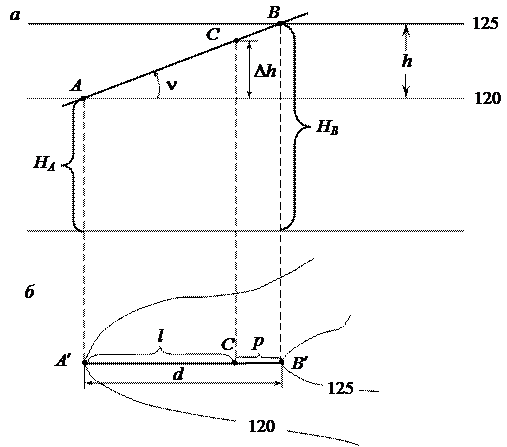 де п – кількість перерізів (закладень) між підписаними горизонталями; Н max, H min – висоти підписаних горизонталей, між якими знаходиться точка А (рис.3.9). Потім визначають напрям схилу місцевості: - напрям бергштриха та низ підпису горизонталей направлені в бік пониження рельєфу; - схили місцевості біля водних об’єктів направлені до берегів річок, озер і т.д.; - за формою відкриті сторони вимоїн направлені в бік пониження; - за підписаними позначками характерних точок рельєфу; - місцевість нахилена в сторону водозбірних ліній і від вододільних ліній рельєфу. Позначка шуканої точки А обчислиться: - від нижньої підписаної горизонталі НА = Н min + h × n 1 = 150 + 1 × 3 = 153 м; - від верхньої підписаної горизонталі НА = Н mах - h × n 2 = 155 - 1 × 2 = 153 м, де п 1, п 2 – кількість закладень між підписаною і шуканою висотою горизонталі. Коли шукана точка знаходиться між горизонталями (рис. 3.10), то її позначку визначають в такій послідовності: 1. Визначають висоти двох суміжних горизонталей (НА, НВ); 2. По перпендикуляру до них через точку С проводять лінію А ¢ В ¢ і вимірюють довжину закладання d (в мм). 3. Вимірюють відстані l та p. 4. Позначку точки С обчислюють за формулою: