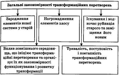 Рис. 10.1. Загальні закономірності трансформаційних перетворень 2. Перехідні економічні системи: зміст і основні риси Перехідні (трансформаційні) економічні системи – це складне явище. В історії розвитку практично кожного суспільства настають періоди, коли стара економічна система занепадає, а в її просторі зароджуються елементи нової системи з тенденцією до самоорганізації та висхідного розвитку. Їх класифікують за двома аспектами: цивілізаційного і формаційного процесів. Аспект цивілізаційного процесу: — від неоліту до бронзового віку; — від бронзового до залізного віку; — від залізного до передіндустріального віку; — від передіндустріального до індустріального віку; — від індустріального до постіндустріального (інформаційного) віку. Аспект формаційного процесу: — від первісного до рабовласницького ладу; — від рабовласництва до феодалізму; — від феодалізму до капіталізму; — від капіталізму до соціалізму; — від соціалізму до капіталізму (для постсоціалістичних країн тощо). У межах кожної цивілізації та кожної суспільно-економічної формації є перехідні стани від однієї стадії розвитку до іншої. Закономірності трансформації в межах ринкової системи: 1. Поглиблення суспільного характеру виробництва. 2. Зміни у розвитку технологічного способу виробництва вимагають нових та відповідної адаптованості існуючих господарських форм. 3. Кожна наступна форма соціально-економічного розвитку породжує нові фактори економічного зростання, не відкидаючи при цьому надбань попередніх. Зміст перехідної економіки – формування нових елементів та об’єднання їх в систему, що дає можливість зайняти панівне місце в ієрархії систем.