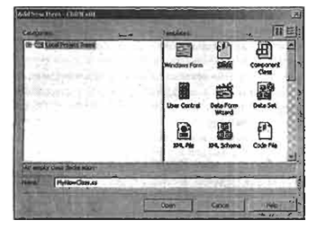 { static void Main(string[] args) { MyComplexClass myObj = new MyComplexClass(); Console.WriteLine(myObj.ToString()); } } Добавление классов В состав VS входят инструменты, которые позволяют ускорять выполнение некоторых наиболее распространенных задач, и некоторые из них применимы для ООП. Один из таких инструментов позволяет быстро добавлять в проект новые классы при минимуме информации, которую необходимо набирать. Доступ к этому инструменту можно получить либо через пункт меню File | Add New Item..., либо с помощью двойного щелчка мышью на имени проекта в окне Solution Explorer и выбора подходящего элемента. В обоих вариантах появляется диалоговое окно, которое позволяет выбрать тип элемента, который требуется добавить. Для того чтобы добавить класс, необходимо выбрать вхождение Class в окне, расположенном справа, ввести имя файла, в котором будет содержаться этот класс, и затем нажать Open. using System;