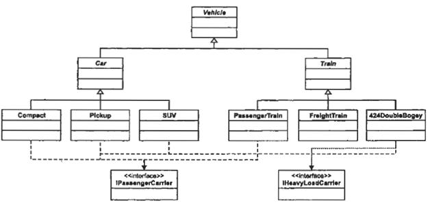 Это указывает на то, что эти два типа предназначаются для совершенно различных целей. Абстрактные классы используются в качестве базовых классов семейств тех объектов, которые обладают общими основными характеристиками, такими как цели, для которых они предназначены, и структура. Интерфейсы используются классами, отличия между которыми могут лежать на гораздо более фундаментальном уровне, но которым при этом может требоваться выполнение некоторых одинаковых действий. В качестве примера представьте себе семейство объектов, представляющих поезда (см. рис. слева). Базовый класс — Train (поезд) — содержит основное определение поезда, куда включается, например, размер колес и тип двигателя (который может быть паровым, дизельным и т. д.). Этот класс, однако, является абстрактным, поскольку в природе не существует такой вещи, как "обобщенный" поезд. Для создания "конкретного" поезда нужно задать характеристики, присущие данному поезду. Это, в свою очередь, требует создания производных классов вроде PassengerTrain (пассажирский поезд), FreightTrain (грузовой поезд) и 424DoubieBogey (424 колесные пары).