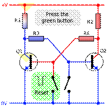 Блок-схема типового супергетеродина. Структурна схема Радіосигнал з антени подається на вхід підсилювача високої частоти (в спрощеному варіанті він може бути відсутнім), а потім на вхід змішувача - спеціального елемента з двома входами і одним виходом, що здійснює операцію перетворення сигналу по частоті. На другий вхід змішувача подається сигнал з локального малопотужного генератора високої частоти - гетеродина. Коливальний контур гетеродина перебудовується одночасно з вхідним контуром змішувача (і контурами підсилювача ВЧ) - зазвичай конденсатором змінної ємності (КЗЕ), рідше котушкою змінної індуктивності (варіометром, ферроваріометром). Таким чином, на виході змішувача утворюються сигнали з частотою, рівній сумі та різниці частот гетеродина і прийнятої радіостанції. Різницевий сигнал постійної проміжної частоти (ПЧ) виділяється за допомогою смугового фільтра і посилюється в підсилювачі ПЧ, після чого надходить до демодулятора, який відновлює сигнал низької (звукової) частоти. У сучасних приймачах в якості гетеродина використовується цифровий синтезатор частот з кварцовою стабілізацією. У звичайних мовних приймачах довгих, середніх і коротких хвиль проміжна частота, як правило, дорівнює 465 або 455 кГц, в побутових ультракороткохвильових - 6,5 або 10,7 МГц. В телевізорах використовується проміжна частота 38 МГц. 3. Мультивібра́тор — релаксаційний генератор електричних коливань прямокутного типу. Термін запропонований голландським фізиком ван дер Полем, тому що в спектрі мультивібратора є багато гармонік — на відміну від генератора синусоїдальних коливань («моновібратора»). Мультивібратор був описаний Ікклзом і Джорданом в 1919 році. Мультивібратор є одним з найпоширеніших генераторів імпульсів прямокутної форми, що представляє собою двохкаскадний резистивний підсилювач з додатнім зворотним зв'язком. В електронній техніці використовуються самі різні варіанти схем мультивібратора, які різняться між собою за типом використовуваних елементів (лампові, транзисторні, тиристорні, мікроелектронні і так далі), режиму роботи (автоколивальних, режиму очікування, синхронізації), видами зв'язку між підсилювальними елементами, способах регулювання тривалості і частоти генерованих імпульсів і так далі. Віднесення мультивібратора до класу автогенератори виправдане лише при автоколивальному режимі його роботи. У режимі очікування мультивібратор виробляє імпульси тільки тоді, коли на його вхід надходять спеціальні сигнали, які його запускають. Режим синхронізації відрізняється від автоколивальних лише тим, що в цьому режимі за допомогою зовнішнього керуючої (синхронізуючої) напруги можна змінювати частоту генерованих коливань. Принцип роботи Схема може знаходитися в одному з двох нестабільних станів і періодично переходить з одного в інший. Фаза переходу дуже коротка завдяки дії позитивного зворотного зв'язку між каскадами посилення. При вмиканні живлення через резистори R2, R3 на бази транзисторів подається напруга, яка відкриває транзистори. При цьому напруга на колекторах починає зменшуватись і ця зміна напруги з виходу кожного з транзисторів подається на вхід іншого, протидіючи його відкриванню. Через розбіжності в параметрах деталей, один з транзисторів відкривається, а інший повністю закривається. Припустим