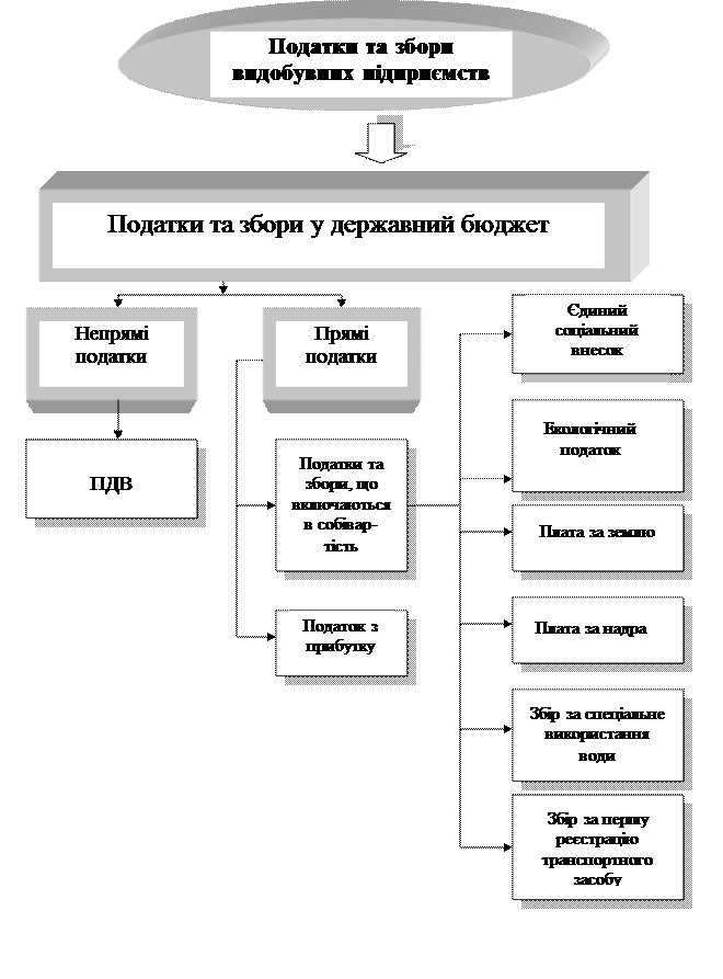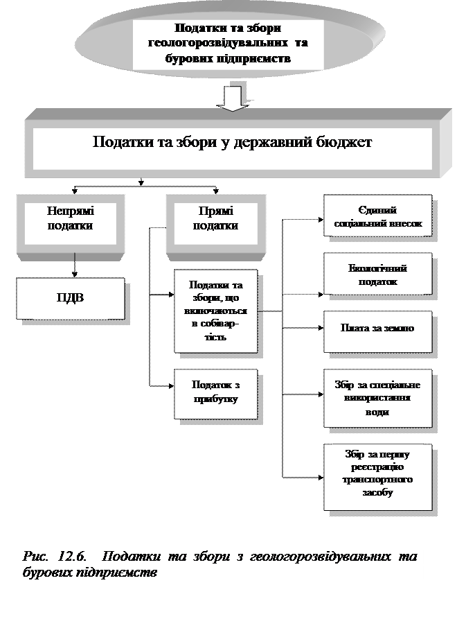 Підприємства НАК «Нафтогаз України» та НАК «Надра України» є платниками прямих та непрямих податків, а також місцевих податків та зборів. Зокрема, НАК «Нафтогаз України» у 2005 році з метою уникнення подвійного оподаткування перейшла на консолідовану сплату ПДВ та податку з прибутку. Консолідований податок – це платіж який відображає діяльність головного і дочірніх підприємств як однієї господарської одиниці та сплачується головним підприємством. Підприємства НАК «Нафтогаз України» в залежності від особливостей їх діяльності є також платниками акцизного збору (переробні підприємства), мита (транспортні підприємства), рентної плати (видобувні, транспортні підприємства), плати за надра (бурові, видобувні підприємства), плати за землю (бурові, видобувні підприємства), єдиного соціального внеску (усі підприємства), екологічного податку (усі підприємства) та інших податків і зборів. НАК «Надра України» перейшла на консолідовану сплату ПДВ у 2009 році та екологічного податку у 2011 році. Розглянемо детальніше, які податки та збори сплачують геологорозвідувальні, бурові та видобувні підприємства (рис. 12.6, 12.7). Податок на додану вартість - непрямий податок, який нараховується та сплачується відповідно до встановлених норм. Платником податку є будь-яка особа, що провадить господарську діяльність і зареєстрована як платник податку. Якщо загальна сума від здійснення операцій у сукупності перевищує 300 000 гривень (без урахування податку на додану вартість), така особа зобов’язана зареєструватися як платник податку в органі державної податкової служби за своїм місцезнаходженням. Об’єктом оподаткування є операції платників податку з постачання товарів, послуг, місце постачання яких розташоване на митній території України, а також ввезення та вивезення товарів (супутніх послуг) у митному режимі. Ставки податку встановлюються від бази оподаткування у таких розмірах: у 2012 році – 20 відсотків; з 01.01.2013 – 17 відсотків. Якщо операції з постачання товарів звільнено від оподаткування на митній території України, до операцій з експорту таких товарів (супутніх послуг) застосовується нульова ставка.