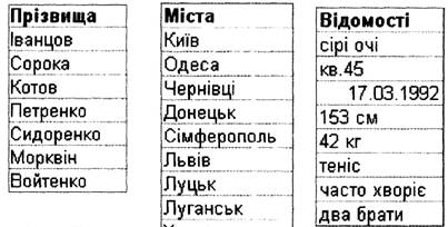 До списків можна віднести перший та другий набори даних. Третій, з назвою Відомості, не можна вважати списком, оскільки дані в ньому не є однорідними. Excel розпізнає списки автоматично. Перед виконанням дій зі списком достатньо активізувати будь-яку комірку всередині списку. Вміст першого рядка Excel вважає іменами полів і не опрацьовує їх, як інші дані. Якщо перед здійсненням обробки списку виділити окрему частину списку, то Excel вважатиме списком тільки виділений діапазон комірок. Як бачимо, створити список можна, використовуючи традиційні засоби роботи з таблицями. Задавши імена полів та порядок їхнього розташування, визначивши ширину стовпчиків та параметри форматування (насамперед для дат, часу, числових значень), можна вводити дані безпосередньо в комірки. Списки можна створювати одним із наведених нижче способів: