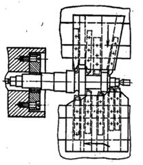 Дрібні східчасті валики діаметром до 25 мм і довжиною до 150 мм обробляються на автоматах подовжнього точіння, револьверних або токарних верстатах. Вали великих діаметрів обробляються на токарних верстатах, токарних гідрокопіювальних чи багаторізцевих напівавтоматах. Останні використовуються для обробки великих багатоступінчастих валів при великому припусках на обробку. У крупносерійному і масовому виробництвах обточування валів проводиться на вертикальних багатопозиційних токарних багатошпиндельних напівавтоматах моделей 1282, 1К0282, 1А283 і інших, на одношпиндельних багаторізцевих напівавтоматах моделей 1А720, 1А730, 1721 і інших, на токарних гідрокопіювальних напівавтоматах 1712, 1722 і т.д. У средньосерійному і дрібносерійному виробництві використовуються токарні верстати оснащені гідрокопіювальними супортами й іншими пристроями, що прискорюють роботу шляхом зменшення допоміжного часу. При обробці на напівавтоматах досягається 11 квалітет точності. Обробка на гідрокопіювальному напівавтоматі одним різцем часто виявляється більш вигідна ніж на багаторізцевому, тому що час настроювання гідрокопіювального напівавтомата в 2—3 рази менший, а обробка більш точна, особливо при довгих ходах. При обробці в центрах передній центр обертається разом з деталлю не зношуючись, нерухомий задній центр зношується. Широке поширення отримали центри, що обертаються, хоча вони менш тверді і вібростійкі. Радіальне биття їх не повинне перевищувати 0,2 допуску на биття обробленої поверхні деталі. Для передачі крутного моменту від шпинделя на деталь застосовуються пальцеві повідкові патрони і хомутики, трьохкулачкові патрони, швидкозажимні повідкові патрони з поворотними кулачками або повідкові втопаючі передні центри. При обробці довгих валів використовуються люнети, які підвищують жорсткість заготовки при обробці в 8—11 разів. Рухомі люнети (двохкулачкові) переміщуються разом з різцем, нерухомі (трьохкулачкові) закріплені на верстаті і проходження різця не допускають. Під люнет проводиться попередня проточка опорної шийки на заготовці або на заготовку надівається гільза, зовнішня поверхня якої служить опорною шийкою. Кулачки люнета можуть бути з бронзовими або сталевими роликовими наконечниками. Іноді замість роликів використовуються шарикопідшипники. Для обробки твердих східчастих валів широко застосовуються токарні багаторізцеві напівавтомати. Економічна точність обробки на них звичайно відповідає 11-13, тому доцільно використовувати їх для чорнової обробки. Характерною рисою цих напівавтоматів є одночасна робота декількох різців, встановлюваних у передньому і задньому супортах. Різці переднього супорта виконують повздовжнє обточування, заднього — проточування канавок, підрізання торців, уступів і зняття фасок. Конусні поверхні обробляються за допомогою копірних лінійок, встановлених у передньому супорті. Обробка довгих ділянок циліндричних поверхонь валів проводиться одночасно декількома різцями, шляхом розподілу довгої ділянки на короткі складові, приклад налагодження токарного багаторізцевого напівавтомата показаний на рис. 2.