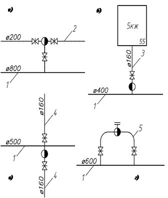 На магістральних лініях допускають встановлення гідрантів тільки із діаметром труб до 400 мм, тому що на магістралях із діаметром труб понад 400 мм пожежні гідранти знижують надійність роботи цих мереж. У цьому випадку [7, п. 8.7] для встановлення пожежних гідрантів та підключень водоспоживачів прокладають дублюючі лінії з діаметром, що дорівнює діаметру розподільчої мережі (рис.5 а), або встановлюють їх на відгалуженнях до будівель (рис.5 б) (внутрішні квартальні мережі).