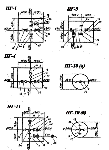 3.Деталювання водопровідних колодязів та камер. Конструктивно поєднання ланок труб і трубопровідної арматури відбувається за допомогою спеціально передбачуваних деталей (фасонних частин), та виконується шляхом облаштування водопровідних вузлів. Для встановлення водопровідної арматури, здійснення поворотів, відгалужень, переходів від одного діаметра труб до іншого, а також з’єднання між собою труб з різних матеріалів застосовують стандартні чавунні (Лабор.зан.3, МВ 055-138), або сталеві зварні фасонні частини [12, с.175..197, МВ 055-130] та сталеві безшовні приварні деталі [3, с. 53..77, МВ 055-130]. Увага!!!!!: Усю водопровідну арматуру, яка має фланцеві типи з’єднань, встановлюють у водопровідних колодязях. Попередньо на конструктивній схемі всі водопровідні колодязі нумерують.