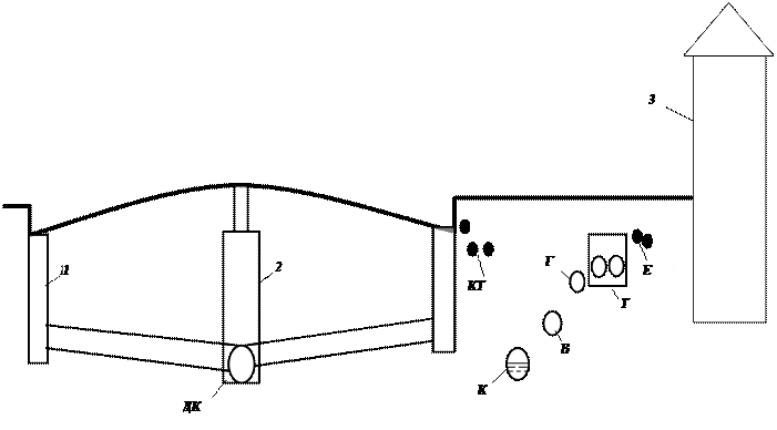 Рис.12. Спільний метод прокладання в колекторі: 1– центральний тепловий пункт; 2– газорегулювальний пункт; 3 – колектор; В– водопровід; Г– газопровід; Т – тепломережа
