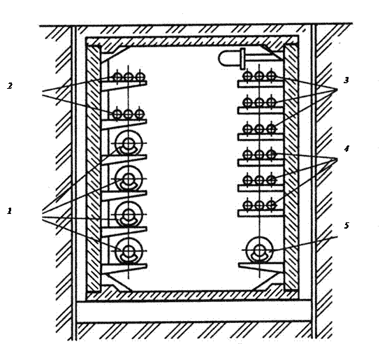 Рис.13. Спільне прокладання мереж у прохідному колекторі: 1 – теплові мережі; 2 – кабелі зв’язку; 3 – силові кабелі; 4 – телефонні лінії; 5 – водопровід