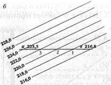 Палетка - це прокреслені на прозорому папері (кальці) паралелі.и рінповіддалені лінії. Щоб визначити кількість ліній, необхідно серед позначок нанесених на карту, знайти їх найменше Нтіп та найбільше Нтах значення '(ниючи величину перерізу рельєфу h, кожній лінії приписують за зрости 1111 я IV нмеоту, кратну h (рис. III. 1.15, а). Значення висоти першої лінії повинно буп меншим за значення Нті„, а значення верхньої - більшим за значення Нтих. Розглянемо, як користуватися такою палеткою. Нехай потрібно знаііп під горизонталей між точками а і в (див. рис. III. 1.15, а), висоти яких відомі Иикреслюють через ці точки лінію. Накладають заготовлену палетку на карі) і.ік, щоб точка а була розташована між лініями палетки, підписаними висота мі ' і 224,0, приблизно на 1А відстані від лінії з висотою 224,0 (дин. рш III. 1.15, а). Розташування точки між лініями палетки оцінюють на око. Вістрям голки фіксують положення ліній палетки відносно точки <, і проколюють голкою палетку і план у точці а). Повертають палетку iiuhkojk иічки а, поки точка в з позначкою 216,8 не опиниться між лініями ііалеікн підписаними значеннями висот 216,0 та 218,0 (див. рис. 1.15, б). Отримуюп, иічки 1, 2, і 3 перетину лінії палетки з висотами 218,0 м, 220,0 м і 222,0 м і шлрічка ав. За допомогою голки наколюють ці точки на карту і підписуюи, шачення їхніх висот. Так інтерполюють горизонталі за іншими напрямками, ні шаченими на зарисах. Після інтерполювання точки з однаковими висотами ноелідонно з’єднують плавною лінією (ізолінією).