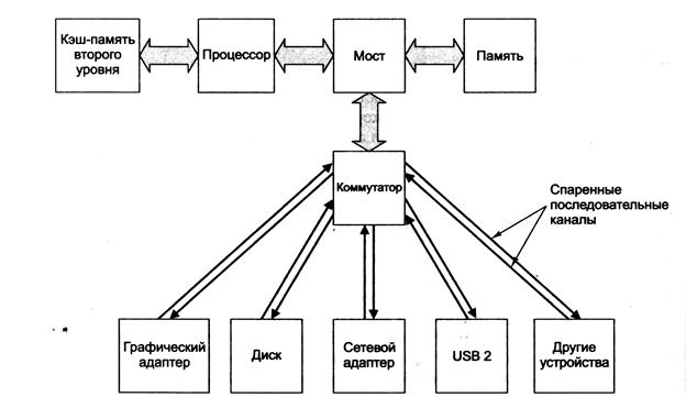 Рис.3.8 В цій архітектурі принциповими є три моменти: - наявність централізованого комутатора, який замінив багатопровідну шину; - послідовне з’єднання замість паралельного; - передача інформації пакетами, як це робиться в мережових технологіях. Фактично мова йде про мережову внутрікомп’ютенру організацію передачі даних. Це принципово новий напрям, який став можливим завдяки високим параметрам інтегральних схем щодо інтеграції та швидкодії.