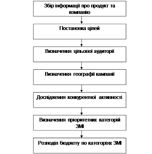 Розробка медіа-плана – це послідовний процес, в якому, звичайно ж, зустрічаються різні варіації дій, які відбиваються в специфічних аспектах рекламної діяльності кожного конкретного підприємства, що, звичайно ж, знаходить певне віддзеркалення в специфіці розробки і здійснення рекламних кампаній даних підприємств. Графічно зображення етапів медіа-планування представлено у вигляді рисунку 1.
