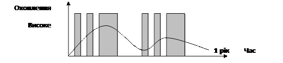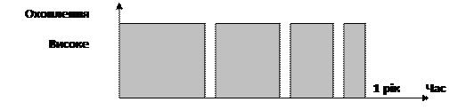 Рис. 3. Бліц-схема 2. Клиноподібна схема. Ця схема частіше за все застосовується при впровадженні на ринок нових товарів. Спочатку вони аналогічні витратам при бліц-схемі, а потім поступово скорочуються. Але особливістю цього методу є то, що для кінцевого споживача вона не буде у вигляді клина, вона буде сприйматися як безперервний послідовний період реклами з одним і тим же охопленням. У цій схемі спочатку використовується принцип охоплення та частоти, поступово переходячи у принцип охоплення, тому що зменшується необхідна частота,