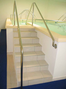 Для пацієнтів, яким на даному етапі реабілітації важко або неможливо скористатися сходами існують підйомники. Підйомники можуть бути як стельового кріплення, так і кріплення на каркасі басейну. Також є підйомники, що працюють від акумуляторної батареї, з механічним або гідропневматичним приводом.