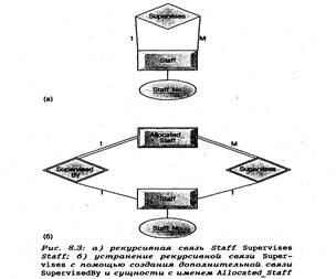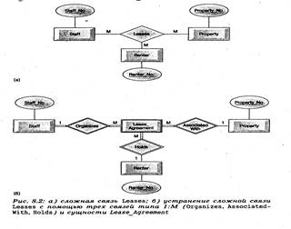 Сложной называется связь, существующая между тремя и больше типами сущностей (см. раздел 5.1.3). Если в концептуальной модели присутствует сложная связь, ее следует устранить с помощью промежуточной сущности. Сложная связь заменяется необходимым количеством бинарных связей типа 1:М, устанавливаемых со вновь созданной сущностью. Например, тройная связь Leases (Сдает внаем), отражает отношения, существующие между оформляющим аренду работником компании, земельным участком и арендатором — как показано на рис. 8.2, а. Эту сложную связь можно упростить путем введения новой сущности и определения бинарных связей между нею и каждой из исходных сущностей сложной связи. В нашем примере связь Leases можно устранить посредством введения новой слабой сущности с именем Lease Agreement. Вновь созданная сущность будет связана с исходными сущностями тремя новыми бинарными связями: