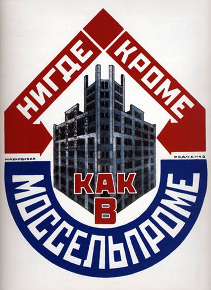 Перший російський «копірайтер» Володимир Маяковський в парі з «арт-директором» Олександром Родченко створив цілу армаду рекламних плакатів, які стали класикою реклами. Маяковський зробив колосальний вплив на рекламні тексти в Росії, а Родченко, будучи майстром радянського фотомистецтва, першим застосував в рекламі фотографію. Рекламні плакати А. Родченко удостоєні срібної медалі на паризькій виставці 1925 року. “Работали с огромным подъемом. Это был ажиотаж и не из-за денег, а чтобы продвинуть новую рекламу всюду. Вся Москва украсилась нашей продукцией. Вывески Моссельпрома - все киоски наши. Вывески Госиздата, Резинотрест. ГУМ. Чаеуправление. Было сделано до пятидесяти плакатов, до сотни вывесок, упаковок, оберток, световых реклам, рекламных столбов, иллюстраций в журналы и газеты. К работе над советской рекламой Володя относился очень серьезно. Утром он ходил и принимал заказы, брал цифровой и тематический материал. Часто это было большое число скучных отчетов, книг, которые он прочитывал и выписывал цифры, темы и прочее”.