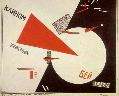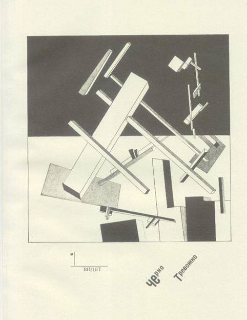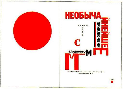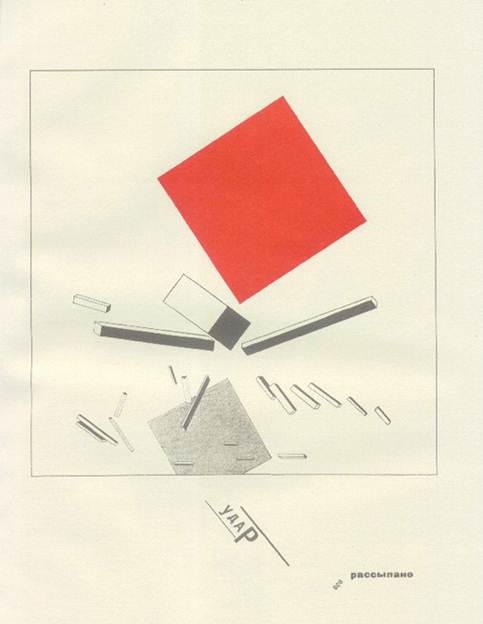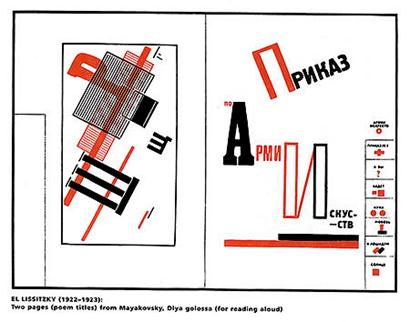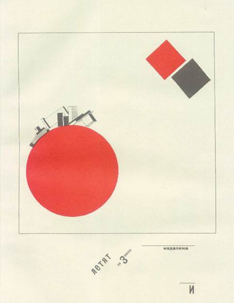 Титульний аркуш побудований на контрастах, що порушують традиційні закони симетрії. Контрасти шрифтів посилені колірним зіставленням червоного і чорного. Заголовок побудований по діагоналі і тому динамічний. Книга — своєрідний мультфільм: всі «кадри» зв'язані безперервним рухом простих однозначних фігур в тимчасовій послідовності, що завершується фінальним тріумфом червоного квадрата. Лисицький відмовився від старих статичних методів оформлення, що залишають недоторканними раму, дзеркало набору (смугу), поля. У журналі «Річ» («Вещ») (1922), де деякі тексти дани на трьох мовах, велику роль грають друкарські лінійки, що отримали нове завдання, — членувати набір. Жирні лінійки на полях «Речі» сприяють концентрації уваги на особливо важливих частинах тексту. Оформляючи сторінки журналу, Лисицький широко використовував елементи друкарської мови як смислові сигнали. Один з основних прийомів виразності, вживаних художником, — контраст шрифтів. Щоб «зловити око», Лісицкий несподівано вводить в текст титульні шрифти або свідомо утрудняє читання слова, сполучаючи в нім два, а інколи і три різні шрифти. Надзвичайно майстерно Лисицький маневрує просторовими формами шрифту в заголовках, майже завжди багатоярусних, тобто набраних в дві або три рядки.