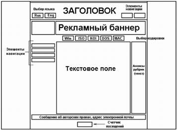 Безусловно, все, что было сказано в данном разделе, является не панацеей, а руководством к действию. Я пытаюсь изложить лишь общие принципы, которые применяются при компоновке структуры сайта, окончательное же решение всегда остается за web-мастером. В конечном счете, какой бы дизайн вы не заложили в основу своего будущего проекта, результат ваших трудов все равно будет правильным: в Интернете нет ни цензуры, ни каких-либо регламентов, за- гоняющих создателя сайта в те или иные жесткие рамки. Примером дизайнерского решения, не попадающим ни в одну из указанных выше категорий, может служить так называемая смешанная компоновка, примерная схема которой приведена на рис. 8. Как видно из рисунка, в данном примере часть управляющих элементов встроена непосредственно в заголовок страницы — речь идет о кнопках переключения между русской и английской версиями сайта, а также о кнопках навигации: это может быть ссылка на адрес электронной почты создателей ресурса, продублированная в нижней части документа, и ссылка на один из тематических разделов, например, страницу новостей. Основной блок элементов навигации позиционирован относительно левой границы документа, однако меню выбора кодировки кириллицы расположено непосредственно под рекламным баннером в верхней части страницы. Текстовое поле разделено на две несимметричные колонки, причем в правой размещены краткие анонсы составляющих ресурс тематических рубрик, включая ссылки на эти разделы. Очевидно, что вариантов «смешанной компоновки» web-страницы может быть великое множество: конкретные решения зависят от количества составляющих ресурс разделов, объема подготовленного для размещения на сайте текста и, наконец, от фантазии самого дизайнера. Важно лишь, чтобы внешний вид сайта не вызывал нареканий у посетителей. В конце концов, только вы как разработчик, вы и никто другой, вправе проявить все свои способности и таланты и скомпоновать страницу по собственному вкусу. Создатели некоторых домашних страничек, не мучаясь сомнениями, размещают счетчик посещений в верхнем правом углу документа, название сайта пишут мелким убористым шрифтом и публикуют его под рекламным баннером, а элементы навигации почему-то неожиданно обнаруживаются прямо в середине текстового блока, между рассказом о себе и фотографиями любимой собаки автора проекта. На вкус и цвет, как говорится, товарищей нет. Но лично мне эта болезнь кажется неизлечимой.