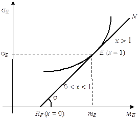 є рівняннями прямої у двовимірному просторі (m – s). Ця пряма називається лінією ринку капіталів і характеризує ПЦП, що складаються як з безризикових ЦП, так і з ЦП, обтяжених ризиком. Якщо Е (mE; s E) є точкою дотику лінії ринку капіталів до множини ефективних портфелів (рис. 8.4), то цю точку називають ринковим (ефективним) портфелем. На рис. 8.4 пряма RFN (лінія ринку капіталів) являє собою множину оптимальних розв’язків, що характеризуються пропорційним (сталим) співвідношенням приросту норми прибутку до зростання ступеня ризику. Якщо х = 0, то це означає, що весь капітал інвестор вкладає у безризикові ЦП. Якщо ж х = 1, то це означає, що весь капітал вкладається у ринковий портфель Е (mE; s E).