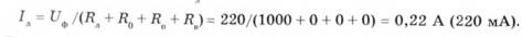 Розглянемо випадок, коли людина доторкається до однієї з фаз трифазної мережі напругою 380В (£/ф =380>/3 =220В) із глухозаземленою нейтраллю (приймаємо Л0 = 0), однак стоїть на неструмопровідній дерев'яній підлозі, що має опір і?п = 60 000 Ом у сухому взутті на гумовій підошві (Я = 50 000 Ом), тоді струм, що може пройти через тіло людини, буде дорівнювати