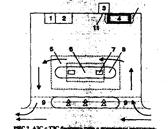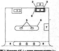 РИС.1. Традиційні АЗС: 1 — очисні споруди; 2 — ємність для збору великих проток; 3 — підземні резервуари; 4 - площадка для АЦ; 5 - будинок операторної; 6 - ПРК; 7 - заправний острівець; 8 - лоток відводу атмосферних опадів, забруднених нафтопродуктами; 9 - положисті борти площадки (пандуси); 10 - лотки відводу великих проток палива