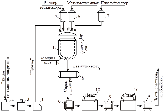 Рис. 1. Производство листового органического стекла 1 - реактор; 2 - станок для приготовления крупки; 3 - шкаф для термообработки крупки; 4 - ларь для крупки; 5-7 - весовые мерники; 8 - вакуумизатор; 9 - тележка с формами; 10 - шкафы полимеризации