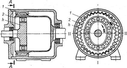 Волновые передачи основаны на принципе передачи вращательного движения за счет бегущей волновой деформации одного из зубчатых колес. Такая передача была запатентована американским инженером Массером в 1959 г. Волновые передачи имеют меньшие массу и габариты, большую кинематическую точность, меньший мёртвый ход, высокую вибропрочность за счёт демпфирования (рассеяния энергии) колебаний, создают меньший шум. При необходимости такие передачи позволяют передавать движение в герметичное пространство без применения уплотняющих сальников, что особенно ценно для авиационной, космической и подводной техники, а также для машин химической промышленности. Кинематически эти передачи представляют собой разновидность планетарной передачи с одним гибким зубчатым колесом. На рис. 14.1 изображены основные элементы волновой передачи: неподвижное колесо 7 с внутренними зубьями, вращающееся упругое колесо 2 с наружными зубьями и водило h. Неподвижное колесо закрепляется в корпусе и выполняется в виде обычного зубчатого колеса с внутренним зацеплением. Гибкое зубчатое колесо имеет форму стакана с легко деформирующейся тонкой стенкой: в утолщенной части (левой) нарезаются зубья, правая часть имеет форму вала. Водило состоит из овального кулачка и специального подшипника.