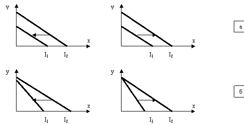 Факторы, которые влияют на бюджетную линию: 1) изменение дохода потребителя; 2) изменение цены на товары. 3) При изменении дохода бюджетная линия перемещается согласно ее увеличению I1>I2 (или уменьшению I2>I1 (рис. 4а) и занимает параллельное предыдущем размещении. Изменение цен на товар X приводит к соответствующему изменению угла наклона бюджетной линии (рис. 4б- на карте).