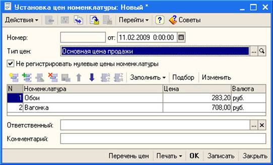 В документе, в поле Тип цен выберем Основная цена продажи, в панели инструментов табличного поля нажмем кнопку Изменить, выберем в появившемся окне действие Изменить цены на % и укажем 20%, применим изменение. После того, как цены изменены на требуемый размер, сохраним и проведем документ. Теперь, если мы решим продать товары и используем в документе тип цен Основная цена продажи - цены будут подставлены автоматически из соответствующего регистра сведений, заполненного документом Установка цен номенклатуры.