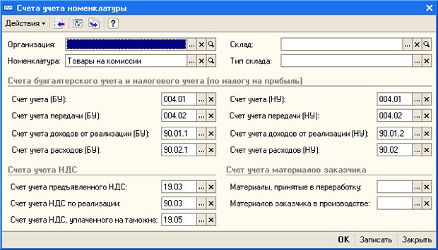 Рис. 12.7. Счета учета номенклатуры для товаров, принятых на комиссию Поэтому, заполняя табличную часть Товары, мы создали новый элемент номенклатуры Обои водостойкие и поместили его в группу Товары на комиссии. В данный момент мы не заполняем информацию о счете-фактуре. Счет-фактура предъявляется по факту продажи товаров после отчета комиссионера перед комитентом. На вкладке Счета учета расчетов в поля Счет учета расчетов с контрагентами и Счет учета расчетов по авансам следует ввести счет 76.09 - его можно использовать для расчетов с комитентом. Проведем заполненный документ и посмотрим, какие движения он сформирует (рис. 12.8).