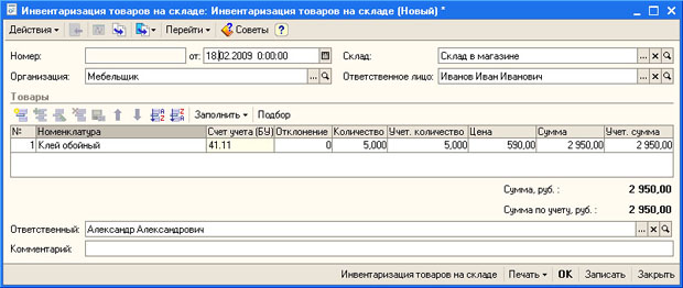 Инвентаризацию товаров можно провести с помощью документа Инвентаризация товаров на складе. Документ можно использовать для проведения инвентаризации на оптовых складах, розничных складах, а так же - на складах, представляющих собой неавтоматизированные торговые точки. Документ можно заполнить автоматически, остатками товаров (или материалов) на соответствующем складе. На рис. 12.32 вы можете видеть документ Инвентаризация товаров на складе.