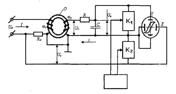 Использование осциллографа в качестве характериографа (режим "X-Y"). Примерами могут служить наблюдение вольт-амперных характеристик нелинейных элементов (транзисторы, диоды и другие), петель гистерезиса магнитных и пьезоэлектрических материалов и элементов с их содержанием. В качестве примера рассмотрим исследование ферромагнитных материалов осциллографическим методом. На образец исследуемого материала, выполненного в виде тороида, нанесены две обмотки с числами витков ω1 и ω2. Через обмотку ω1, последовательно с которой включен резистор R0, пропускается ток I0, создающий определенное значение напряженности Н магнитного поля. Следовательно, падение напряжения на R0, равное U h =I*R o, будет пропорционально значению Н. Это напряжение подключается к входу Х осциллографа, а на вход Y подается напряжение с выхода интегрирующей RC- цепи, играющей роль нагрузочного сопротивления
